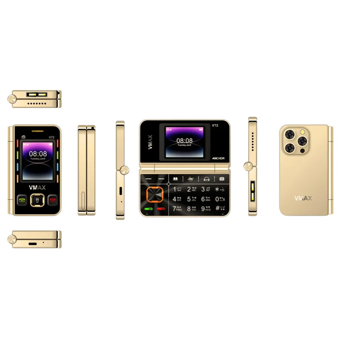 This Vmax V72 Flip Mobile features a dual SIM slot, dual display with dual touch function. It is a foldable mini phone. The mobile also has a Type-C charging cable. The battery of the mobile is 2500mAh, which ensures longer battery backup. It is an ideal phone that has both functionality and style. It also supports FM radio.